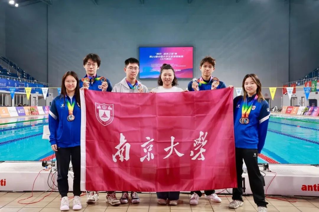 刘亦凡(左三)与南京大学游泳队在赛场合影