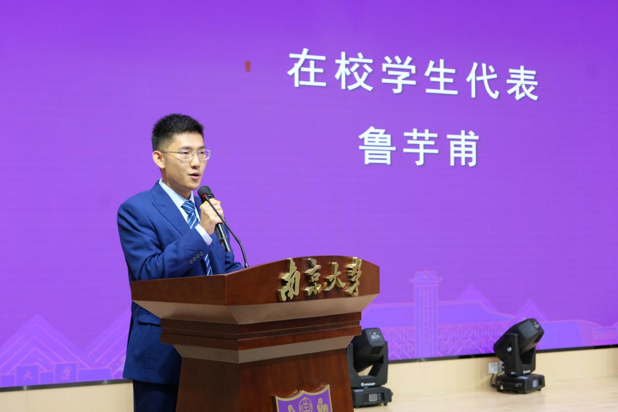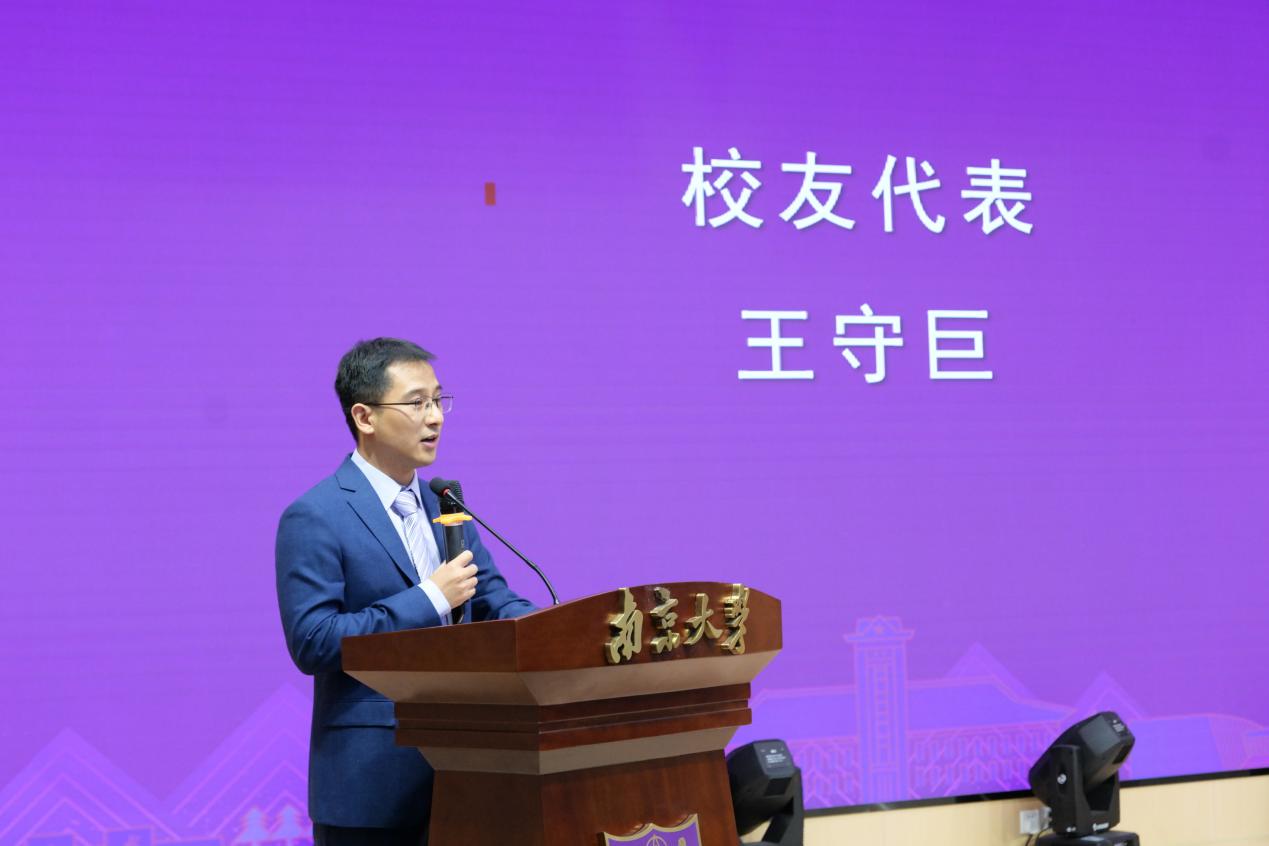 校友代表国家级青年人才,南京医科大学影像学院副院长、江苏省人民医院放射科副主任王守巨发言。他与同学们分享了自己对“白大衣”的理解,希望同学们珍惜学习机会,精进专业能力,涵养高尚道德品格,锤炼严谨工作作风。最后,他勉励同学们不畏艰难,勇往直前,成为有温度、有能力、有担当的医者,为守护人民健康贡献自己的力量。