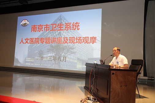 在两个小时的时间里,丁义涛院长密切结合医院实际,从人文医院的建设背景、创新公立医院改革模式、人才培养模式、人文医院管理模式等方面介绍了鼓楼医院近十年来在人文医院建设方面所取得的成效,分享了许多宝贵的经验。一张张珍贵的老照片、一串串鲜活的数据和一个个生动的事例,深入浅出,精彩纷呈的讲授,让与会者受益匪浅。讲座结束后,所有参会人员还分组参观了鼓楼医院历史纪念馆和新大楼,进行现场观摩。