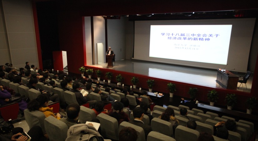 党委书记洪银兴教授作题为“学习十八届三中全会关于经济改革的新精神”的专题讲座。南京市卫生局党委副书记何述渝以及各区卫生局领导班子、各直属单位领导班子、局机关全体干部和卫生系统教育实践活动办公室成员等300余人参加了此次活动。