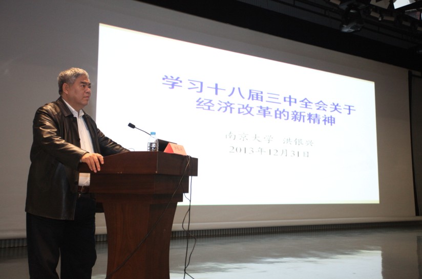 洪银兴教授的讲座共分四大块内容,一是以经济体制改革的核心为切入点,介绍了实现市场决定资源配置的改革措施及完善市场体系的具体做法。二是坚持和完善基本经济制度,重点解析了在十八届三中全会后产权保护制度、混合所有制经济、现代企业制度的变革。三是围绕社会公平正义,向大家分析了收入分配体制改革、农村土地制度改革、新阶段城镇化的变化。四是从政府的角度出发,展示了地方政府政绩考核和以开放促改革的新思路、新方向、新做法。