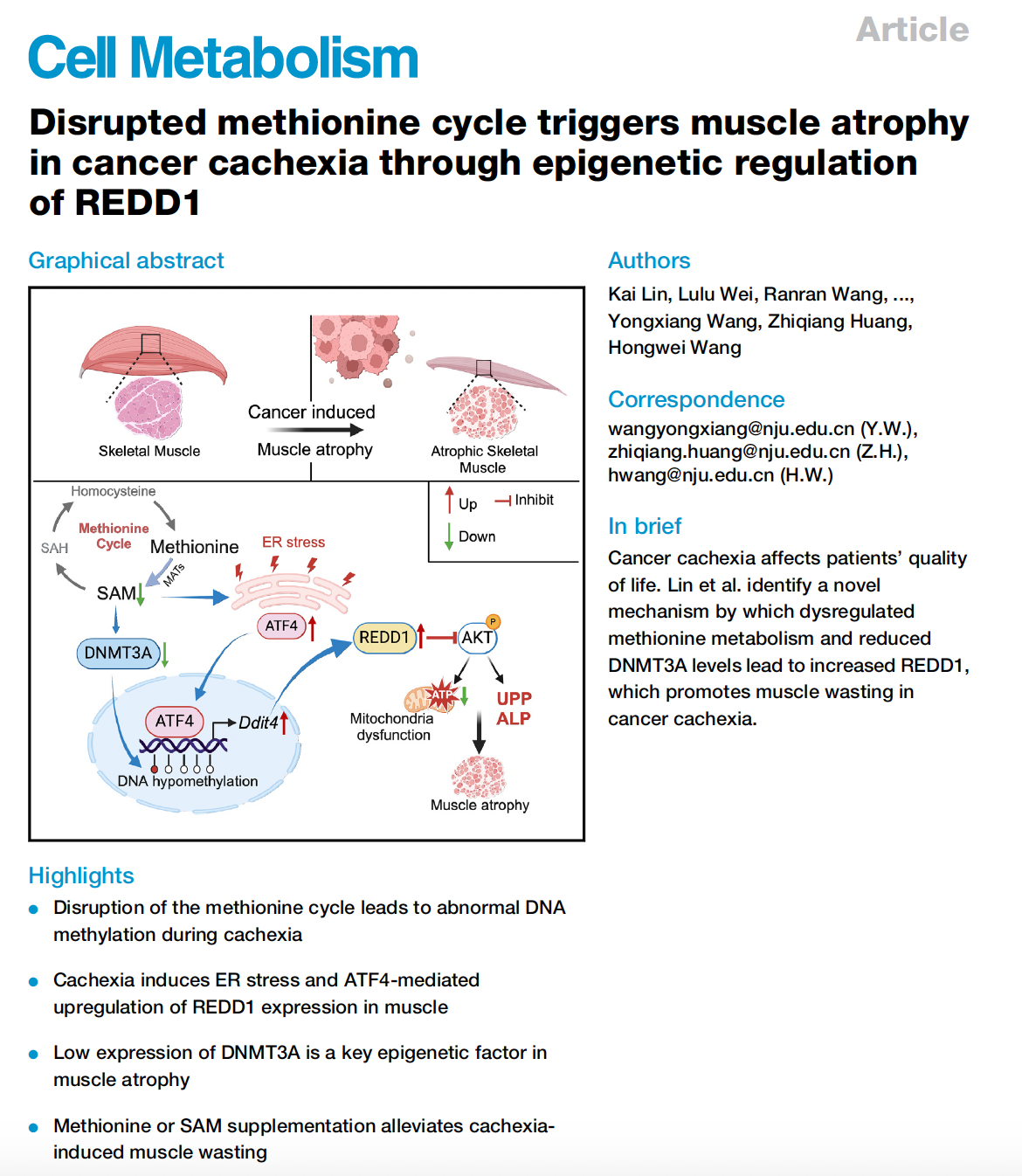 2024年12月26日,Cell Metabolism在线发表了南京大学医学院王宏伟教授、助理教授黄志强团队与苏北人民医院王永祥教授团队合作的研究论文,题为”Disrupted methionine cycle triggers muscle atrophy in cancer cachexia through epigenetic regulation of REDD1”。该研究首次报道了恶液质引起的骨骼肌萎缩的重要代谢网络,揭示了DNMT3A-ATF4-REDD1的表观调控机制,并提出恢复蛋氨酸循环和SAM补充是改善恶液质骨骼肌萎缩的潜在营养干预途径。