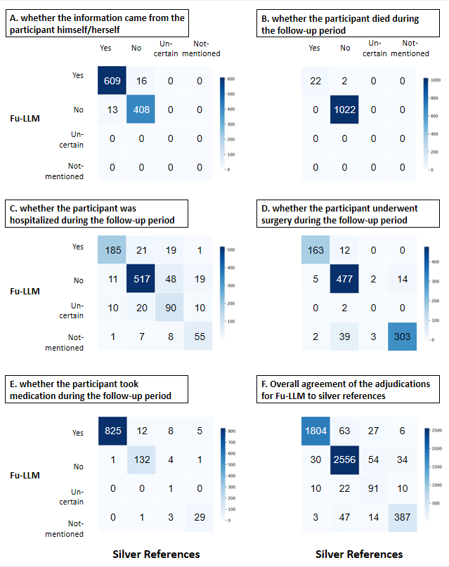在性能验证中,Fu-LLM表现出色,其与参考标准的一致性达到93.7%,敏感性为97.5%,特异性为95.0%,阴性预测值高达98.2%。与当前主流大语言模型(如GPT-3.5-turbo、GPT-4o、DeepSeek-v3、Claude 3.5-Sonnet、Gemini-2.0-Pro)相比,Fu-LLM在一致性、敏感性和特异性方面均有显著优势。同时,Fu-LLM也超越了经典的机器学习方法(如支持向量机模型),并在与人类随访人员的对比中展现出更高的一致性(92.3% vs. 83.4%)和效率。此外,Fu-LLM在时间漂移测试(Temporal drift testing)中表现出比GPT-4更稳定的性能,避免了因模型版本迭代导致的输出波动。