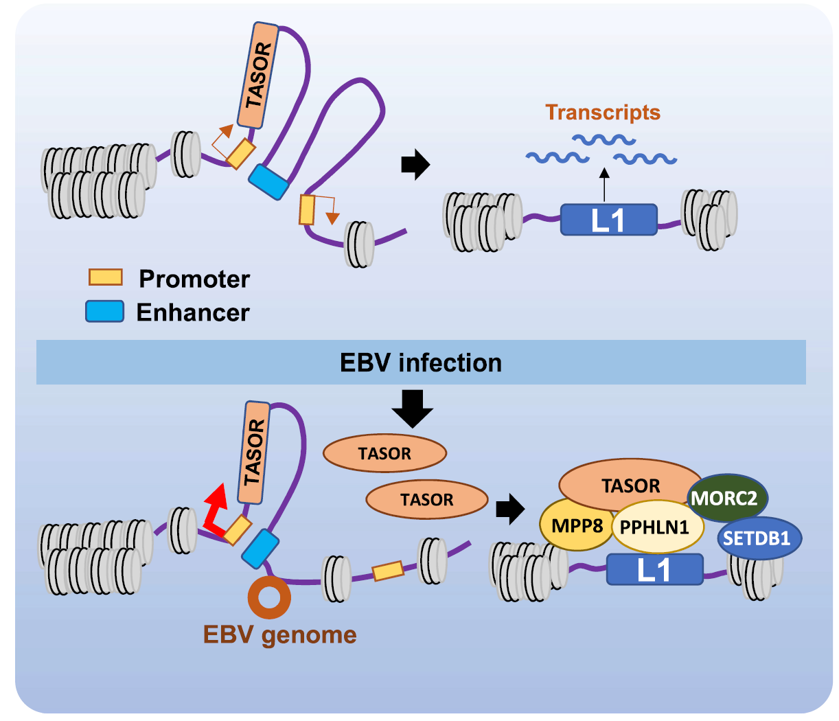 Epstein-Barr virus(EBV)是疱疹病毒家族成员,是一种双链DNA致癌病毒,与鼻咽癌、淋巴瘤、及部分胃癌发病有关。EBVaGC是一种具有独特分子特征的临床胃癌亚型,占胃癌病例的10%左右,然而EBV感染在该亚型胃癌发生发展中的作用仍不清楚。色情动漫 何素素/李尔广团队以EBVaGC作为模型,研究了EBV感染对长散布元件LINE-1转座子表达的影响,发现EBVaGC中病毒基因组黏附于宿主HUSH复合物核心蛋白TASOR基因编码区域,导致TASOR增强子和启动子之间相互作用增强,导致TASOR高表达,进而促进HUSH复合物形成,在内含子区年轻全长LINE-1上沉积,抑制LINE-1转座子表达。人类基因组中将近50%的序列为转座子,其中LINE-1转座子占比最高,也是人类基因组中唯一具有自主转座活性的转座子,经由转录-逆转录完成转座周期,可破坏或影响插入位点基因结构和表达,在肿瘤细胞中常出现LINE-1表达失调或异常转座事件,因此可能与肿瘤发生发展有关。课题组从病毒与宿主基因组相互作用的角度阐述了LINE-1表达与EBV相关胃癌(EBVaGC)的关系,为研究病毒感染与癌症等疾病的发生发展提供了新的思路和研究方向。