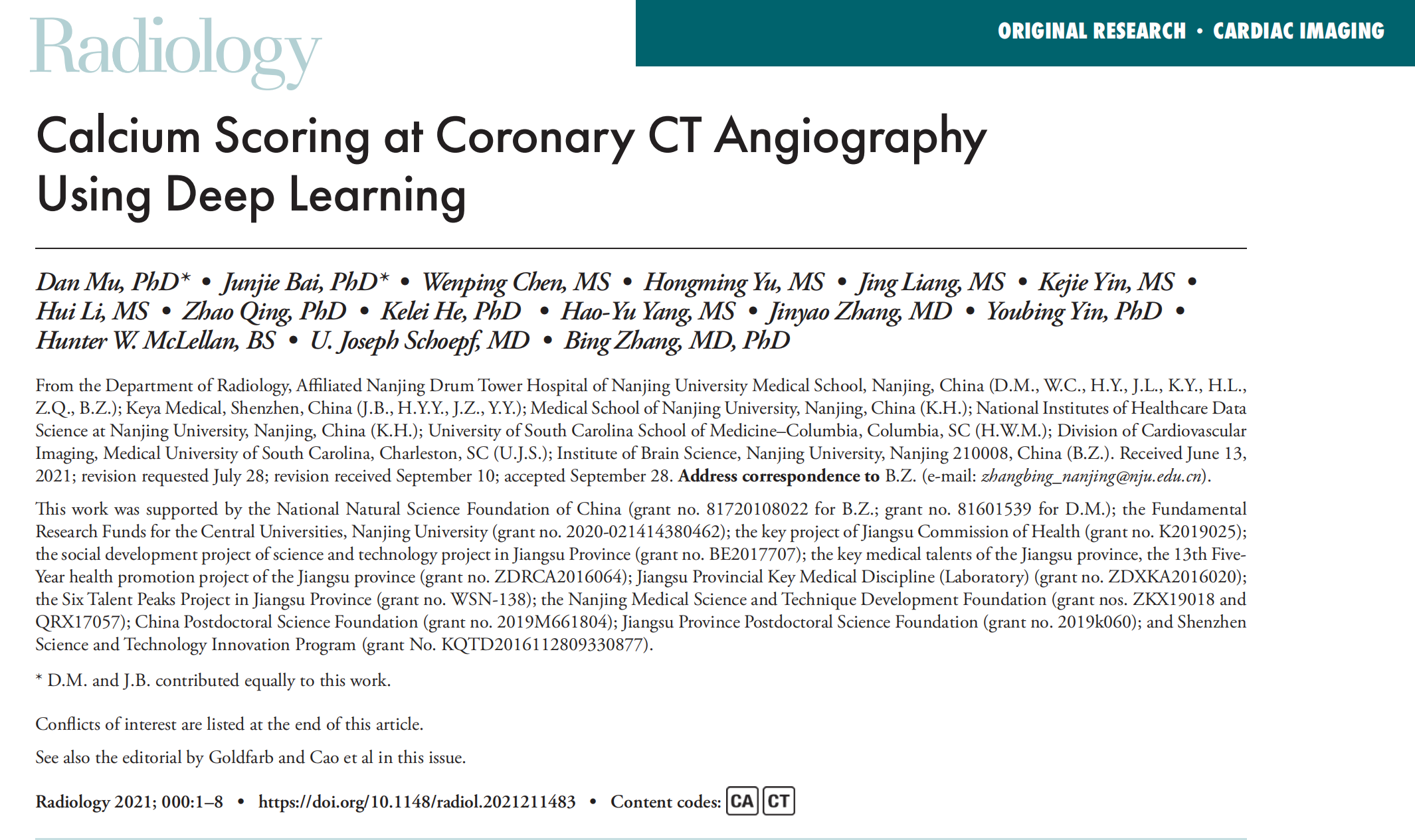 该研究以 “Calcium Scoring in Coronary CT Angiography using Deep Learning”为题首登放射学顶级期刊Radiology上, 色情动漫 附属鼓楼医院医学影像科牡丹为本文第一作者,张冰教授为通讯作者。来自纽约罗斯林圣弗朗西斯医院和心脏中心的心血管影像科学家 James W. Goldfarb博士和心血管影像中心主任 J. Jane Cao博士同期发表述评:临床工作中可以省去增强CTA前的平扫,直接进行钙化积分,既降低辐射剂量,又提高准确率。