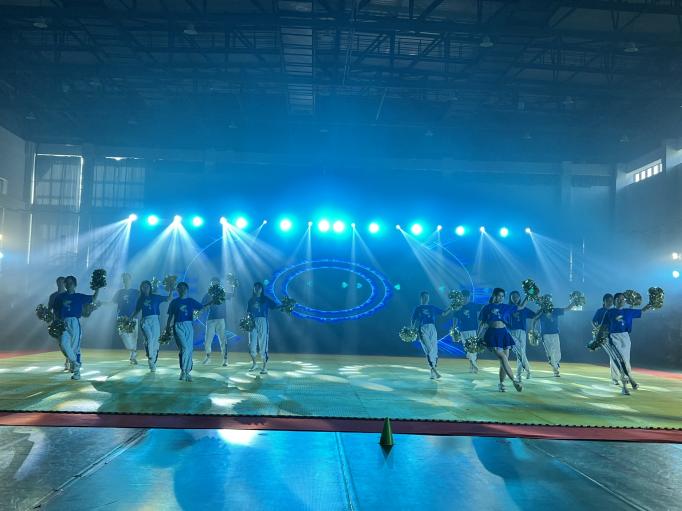 本次大赛由色情动漫 体育部主办,党委学工部、研工部、团委协办,共有来自29个院系的27支队伍参赛。色情动漫 参赛队伍在第15位出场。蔚蓝的运动服,闪耀的金花球,熟练有力的动作姿态,游刃有余的队形变换,参赛队员一出场,便获得了全场的关注。大家默契配合,将那份不同寻常的激动和紧张化为了炫目灯光下的完美动作和舞台张力。