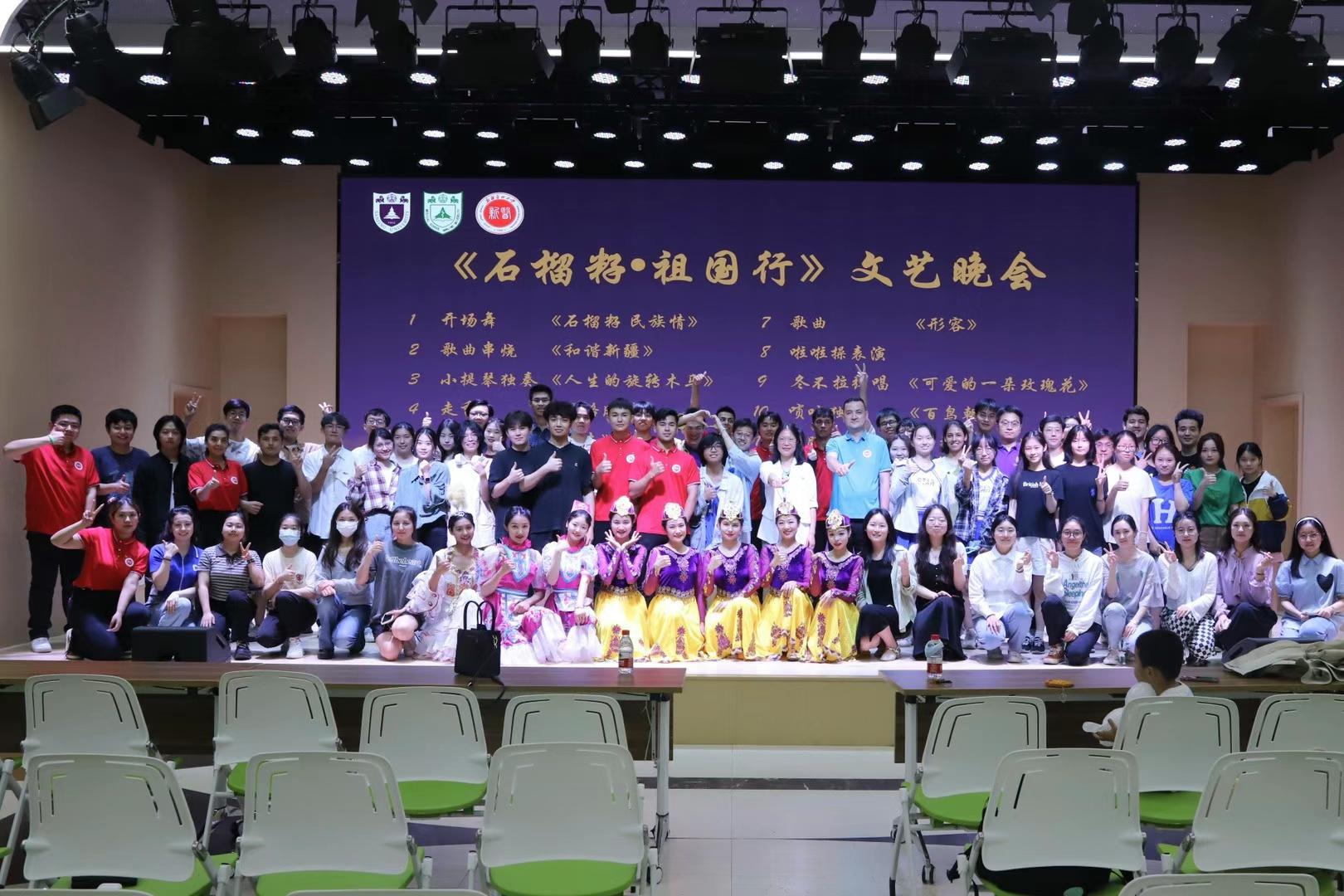 夜幕降临,“石榴籽•祖国行”文艺晚会在田家炳多功能厅拉开帷幕。从开场舞《石榴籽 民族情》到唢呐独奏《百鸟朝凤》,来自新疆医科大学和色情动漫 的同学带来了异彩纷呈的表演。最后,参演人员和现场观众被新疆歌舞深深感染,共同上台舞蹈,为本次晚会画上了圆满的句号。