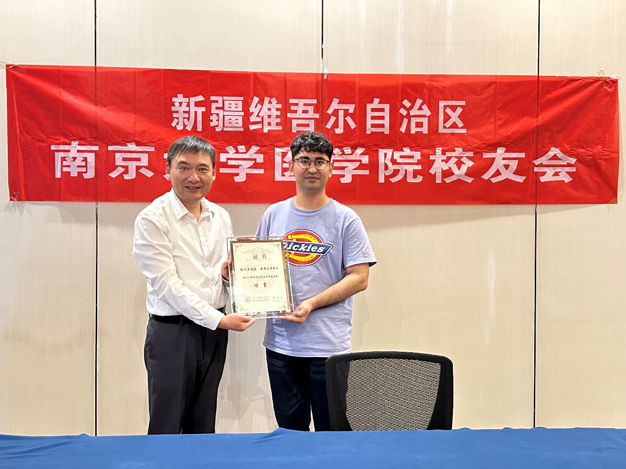 会上,沈苏南还向哈力木拉提·吾布力卡斯木颁发了南京大学校友总会医学院校友会理事证书。