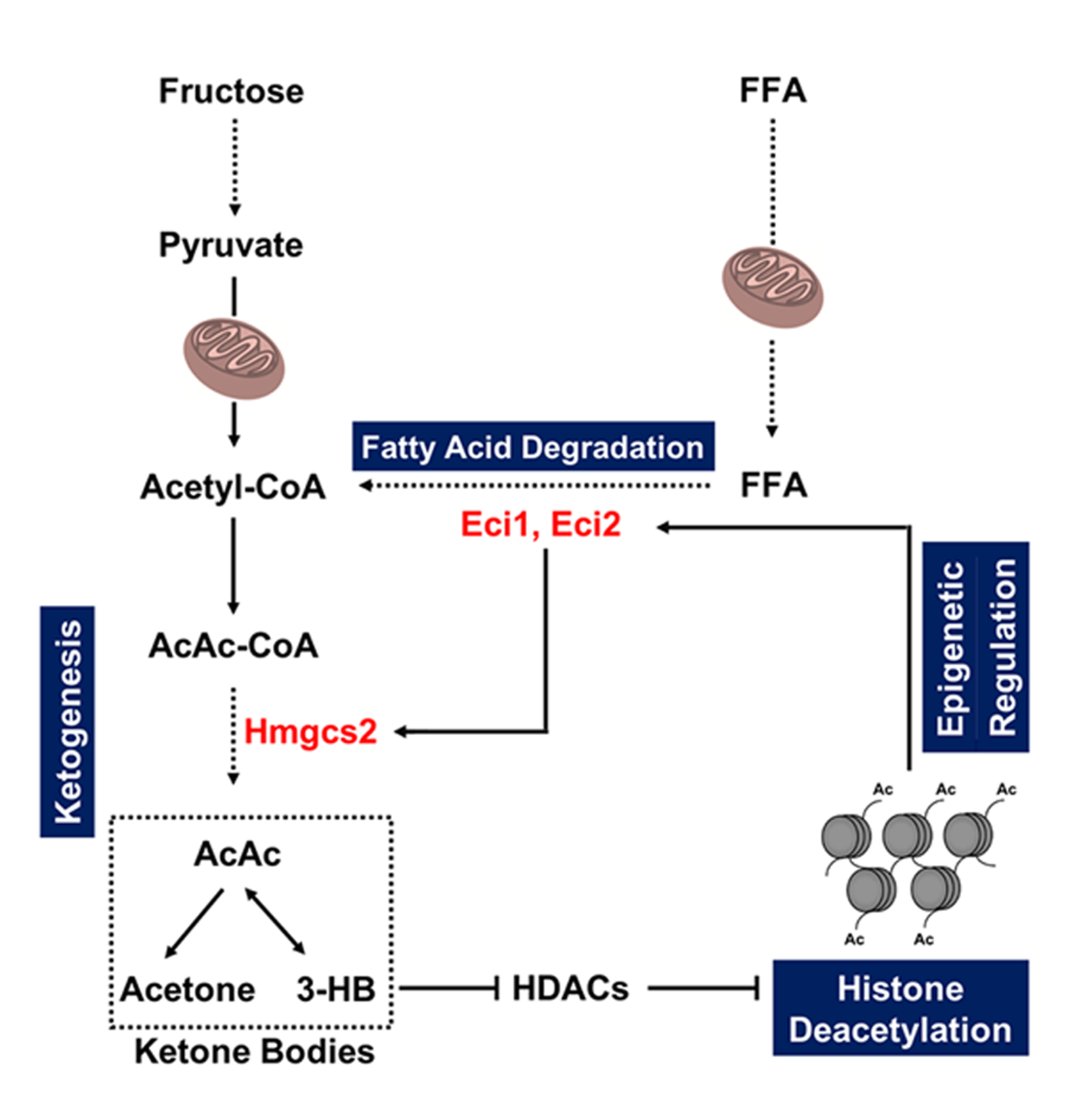 在该研究中,作者利用定量蛋白质组学策略来全面表征高果糖饮食诱导大鼠肾小球足细胞损伤进程中的动态变化(建模16周),发现长期高果糖摄入可驱动足细胞线粒体代谢重编程(包括三羧酸循环、脂肪酸降解和氧化磷酸化)。酮体生成的核心限速酶3-羟基-3-甲基戊二酰辅酶A合酶2(Hmgcs2)在建模第8周开始显著增加。Hmgcs2的上调增加了β-羟基丁酸(3-HB)的水平并且抑制了组蛋白去乙酰化酶(HDAC)活性,促使组蛋白H3和H4的乙酰化水平显著上调以激活脂肪酸降解相关酶类Eci1和Eci2的表达。更重要的是,该研究还发现Eci1或Eci2可通过正反馈机制进一步提升足细胞模型中的Hmgcs2水平,在高果糖诱导的足细胞损伤过程中调节线粒体代谢重编程并最终导致线粒体失调。