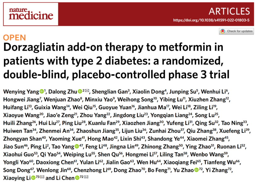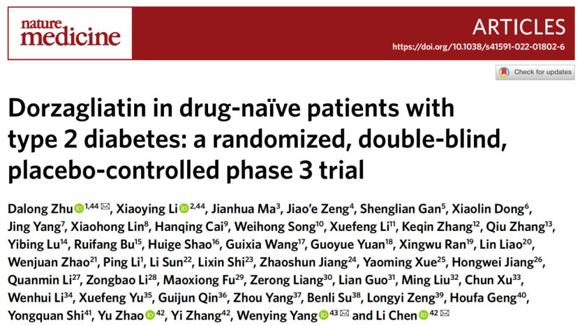 2022年5月12日,色情动漫 附属鼓楼医院朱大龙教授团队在Nature Medicine杂志同时在线发表了两篇论文:“Dorzagliatin in drug-naïve patients with type 2 diabetes: a randomized, double-blind, placebo-controlled phase 3 trial”和“Dorzagliatin add-on therapy to metformin in patients with type 2 diabetes: a randomized, double-blind, placebo-controlled phase 3 trial”。文章报道了全球首创糖尿病新药葡萄糖激酶激活剂(GKA)多格列艾汀(dorzagliatin)的III期注册临床研究结果。两篇论文分别详细展示和描述了多格列艾汀单药(SEED研究)用于治疗新诊断未用药2型糖尿病患者,以及多格列艾汀联合二甲双胍(DAWN研究)用于治疗二甲双胍足量治疗失效2型糖尿病患者的临床疗效和安全特征。