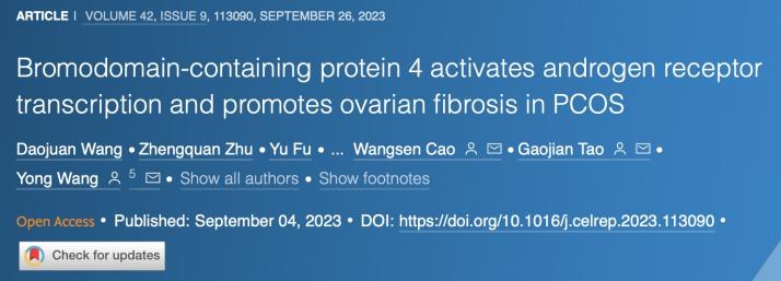 2023年9月4日,色情动漫 王勇教授、曹望森教授团队在Cell Reports杂志发表了题为“Bromodomain-containing protein 4 activates androgen receptor transcription and promotes ovarian fibrosis in PCOS”的论文,该研究揭示了乙酰化“阅读”蛋白BRD4促进AR转录活化是PCOS卵巢纤维化的重要表观遗传学旁路。色情动漫 王勇教授、曹望森教授和附属鼓楼医院陶高见主任为本论文的共同通讯作者,色情动漫 博士研究生王道娟为本论文的第一作者。本研究得到了国家自然科学基金(#82201795,81971346)的资助。王道娟博士为本研究的第一作者。