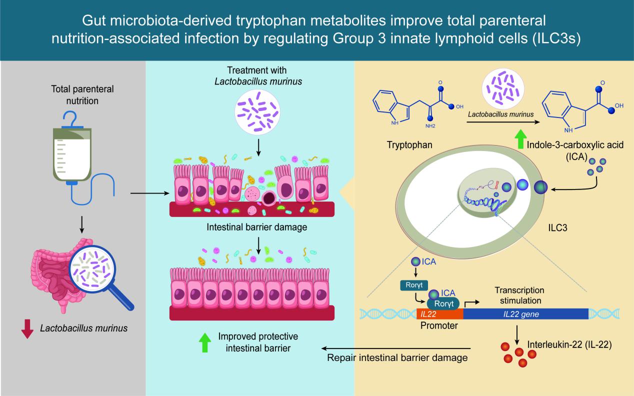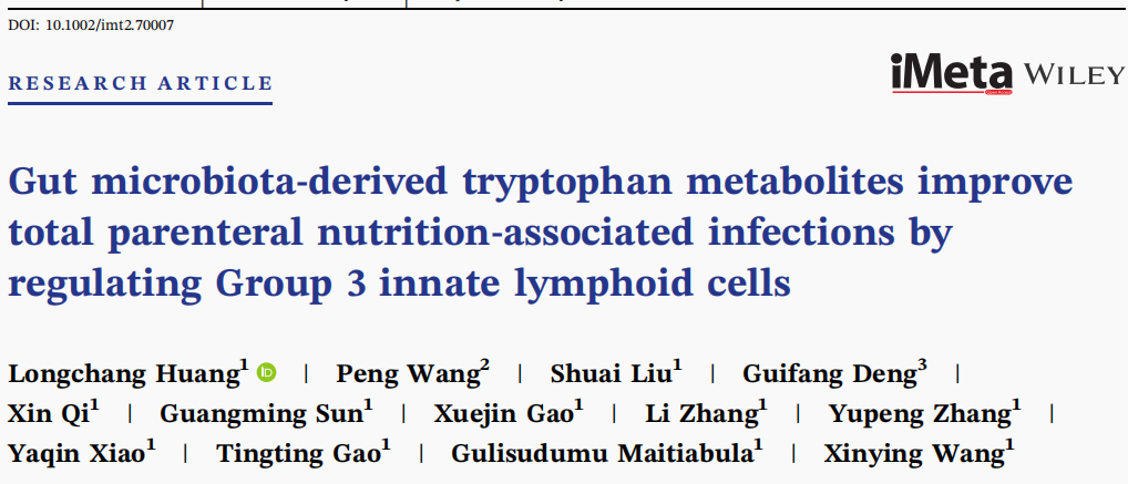 2025226日,南京大学附属金陵医院王新颖课题组在iMeta在线发表了题为“Gut microbiota-derived tryptophan metabolites improve total parenteral nutrition-associated infections by regulating Group 3 innate lymphoid cells”的研究成果。这项研究阐明了TPN过程中的“微生物-代谢-免疫”的调控机制,证明了靶向肠道微生物及肠道免疫稳态治疗IF、实现真正的“人工胃肠”是有希望的,为扭转“肠衰竭”不良结局和促进IF病人的肠康复治疗提供了重要的理论基础。南京大学医学院博士生黄龙昌、王鹏、刘帅和华中科技大学协和深圳医院邓桂芳为本文的共同第一作者。南京大学医学院附属金陵医院王新颖教授为本文的通讯作者。该项研究得到了国家自然科学基金委、科技部、江苏省科技厅以及中央高校等基金的支持,并在相关研究方面得到合作实验室的大力协助与支持。