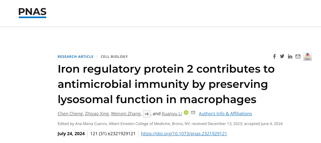 南京大学医学院李宽钰教授课题组和附属鼓楼医院病理科樊智文副研究员合作,利用葡聚糖硫酸钠盐(DSS)造肠炎模型后,意外发现Irp2缺失小鼠有肝脓肿表型。为了探究IRP2在保护机体免受肠源性感染造成肝脓肿中的作用及其机制,研究人员首先给予Irp2全身敲除和髓系细胞Irp2敲除小鼠间隔DSS饮水构建肠道屏障损伤后,发现Irp2缺失后不影响中性粒细胞载菌量变化,只增加巨噬细胞载菌量,同时发现Irp2缺失并不影响巨噬细胞的吞噬功能和溶酶体递送功能,但显著影响溶酶体的生物合成和酸化能力。进一步机制研究发现Irp2缺失上调Hif2a表达,引起乳酸脱氢酶的活性和乳酸水平增加,促进转录因子TFEB的磷酸化,导致TFEB不能正常入核,溶酶体生物合成减少,酸化能力下降,降低了巨噬细胞清除细菌的能力。因此,Irp2缺失后,病原菌有机会从受损的肠屏障进入门静脉,不断侵袭和易位进入肝脏,促进肝脓肿的发生发展。