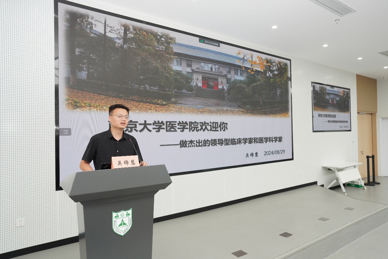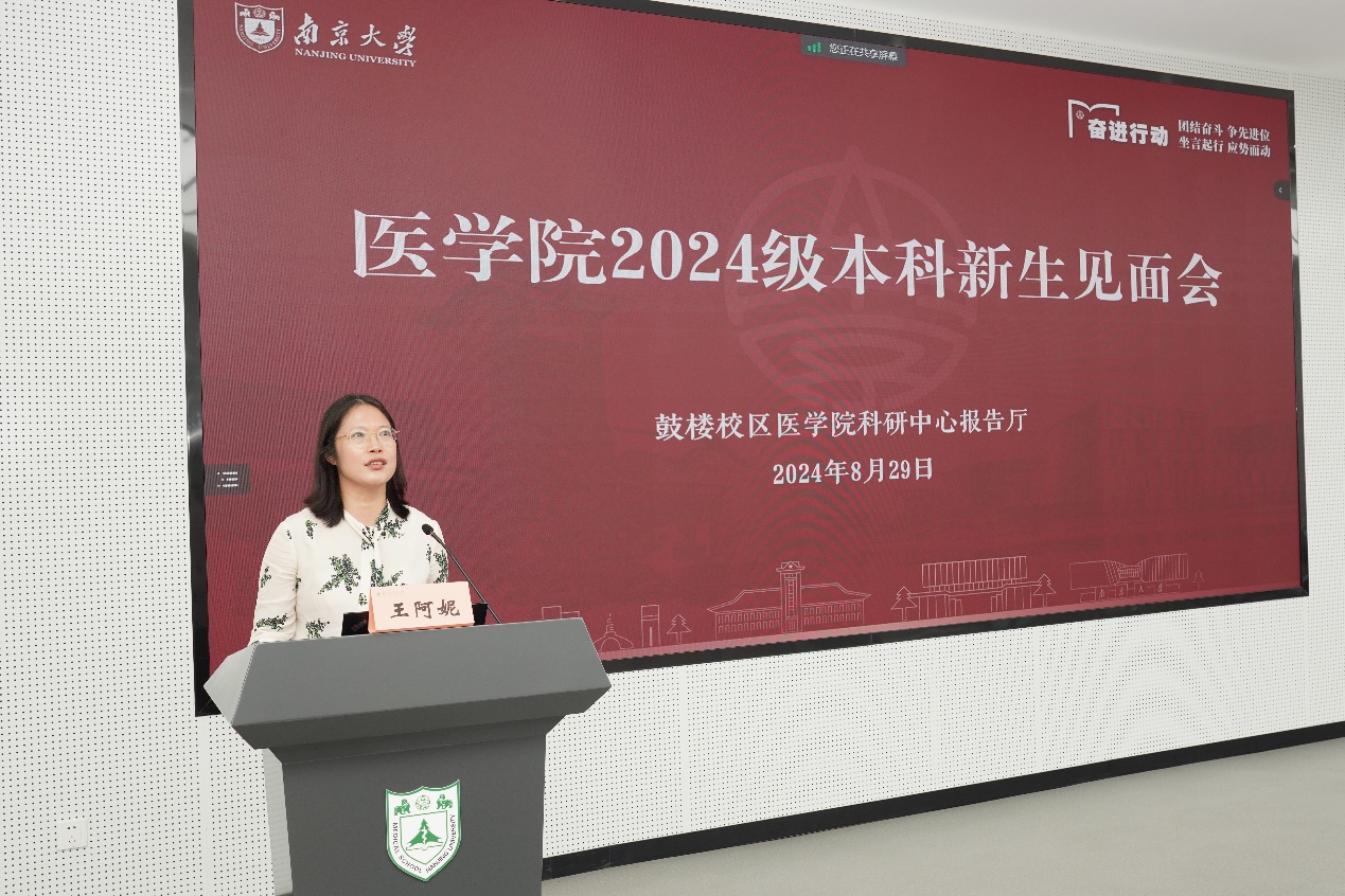 王阿妮首先向新生表示热烈欢迎,并从性别比例、专业分布和生源地等方面介绍了2024级医学专业新生概况。吴锦慧以“南京大学医学院欢迎你——做杰出的领导型临床学家和医学科学家”为题,向新生及家长详细介绍了南大医学院的历史沿革、发展现况及培养目标。