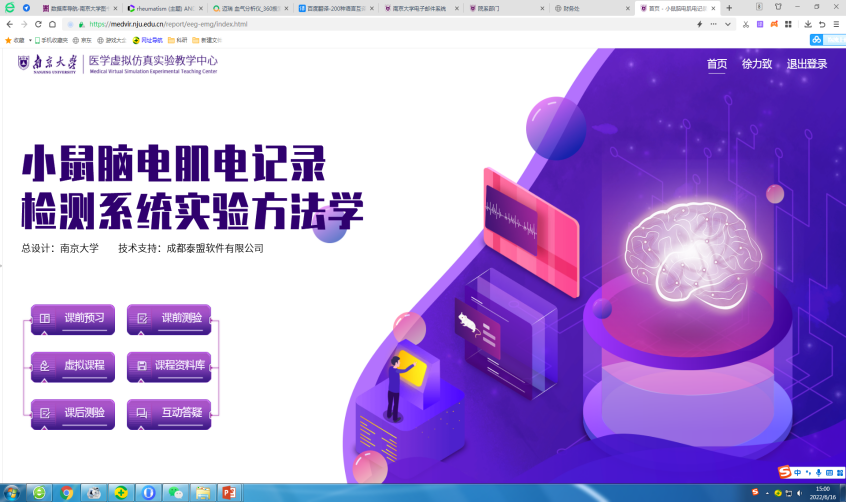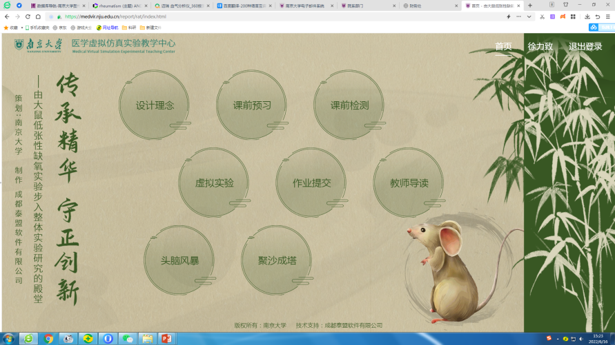学院建设了medvir.sqdongman.com基础医学虚拟仿真实验平台网站。自主设计多个教学虚拟仿真实验项目以满足目前人才培养需求,鼓励教师和学生在教学活动中做时代的“破局者”,已部署《传承精华,守正创新——由大鼠低张性缺氧实验步入整体实验研究的殿堂》《世界上没有完全相同的两片树叶——由家兔急性坏死性肾病特案学习临床诊疗的预案设计》《迷境求索,显智得识——使用水迷宫系统检测长期微囊藻毒素-LR暴露对小鼠学习认知功能的影响》《知音辨位,显智得识——使用条件恐惧系统检测小鼠学习与记忆》等九个虚拟仿真实验项目。