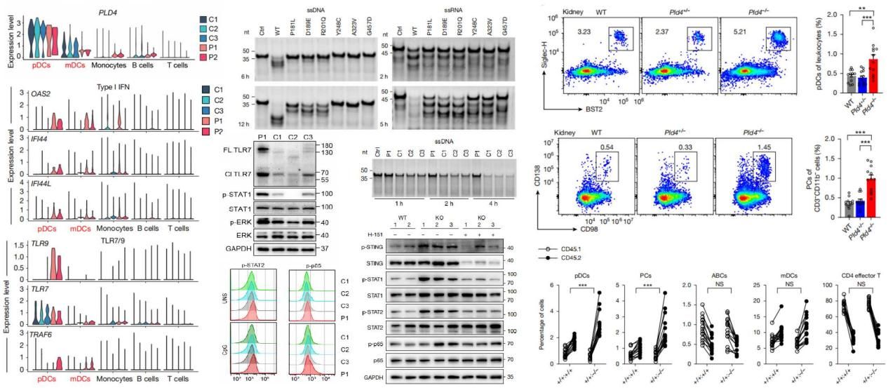 2025年9月10日,南京大学医学院附属金陵医院刘志红院士团队在Nature杂志在线发表了题为《Loss-of-function mutations in PLD4 lead to systemic lupus erythematosus》的研究论文,首次确证了PLD4基因功能缺失性突变可导致人类SLE;阐明了PLD4突变引起Toll样受体7(TLR7)和TLR9过度活化,激活I型干扰素信号通路,驱动浆细胞样树突状细胞(pDCs)与浆细胞(PCs)内在性扩增,导致自身免疫稳态失衡和SLE的核心分子机制;提出了基于核心致病通路的精准干预策略。