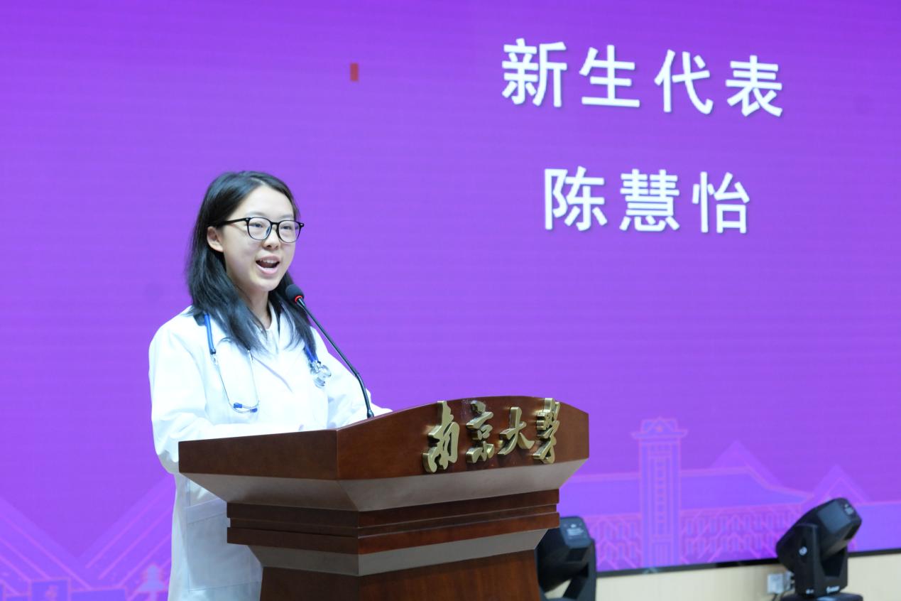 医学院在校学生代表、2021级本科生鲁芋甫同学发言。他分享了自己的学习感悟,讲述了挺身而出救助心脏骤停路人的经历,并提出了三点建议:一是认真学习,拓宽视野;二是学会取舍,劳逸结合;三是永葆好奇,勇于挑战。他祝愿学弟学妹们怀揣热爱与信念,练就过硬的专业能力,在医学院成就最闪耀的自己。2025级新生代表陈慧怡同学发言。她表示,白大衣承载着守护生命的千钧重托和仁心济世的职业信念。同学们将牢记医学生誓言,坚守初心,刻苦钻研,为医学事业的发展贡献青春力量。