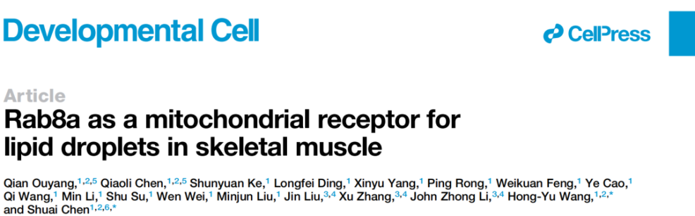 2023年2月16日,南京大学医学院模式动物研究所的陈帅/王宏宇团队在《Developmental Cell》杂志上发表了题为“Rab8a as a mitochondrial receptor for lipid droplets in skeletal muscle”的研究论文。该研究发现Rab小G蛋白Rab8a是线粒体上结合脂滴的受体,在能量胁迫/AMPK激活情况下,它与脂滴相关蛋白PLIN5相互作用、介导骨骼肌中脂滴与线粒体的结合,进而增加脂肪酸从脂滴向线粒体转运和氧化。南京大学医学院博士研究生欧阳茜和助理教授陈俏利为该论文的共同第一作者,陈帅教授和王宏宇副教授为本文的共同通讯作者。