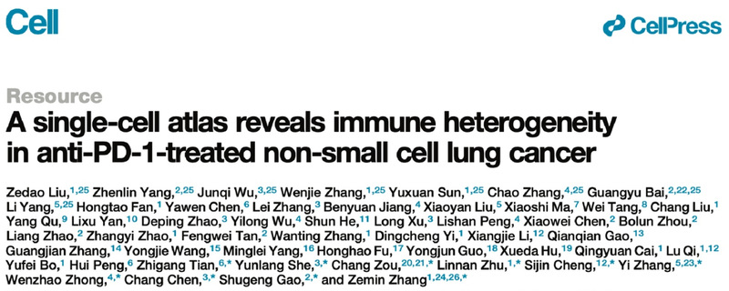 2025年3月26日,我院校友陈昶教授与北京大学生物医学前沿创新中心张泽民院士等合作团队,在国际期刊Cell上以Resource形式在线发表了题为“A single-cell atlas reveals immune heterogeneity in anti-PD-1-treated non-small cell lung cancer” 的研究论文。陈昶教授及胸外科佘云浪副研究员为该论文的共同通讯作者,胸外科吴俊琪医师为该研究的共同第一作者。