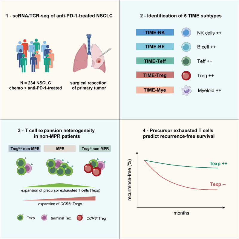 该研究依据每例患者肿瘤中不同免疫细胞亚型的相对丰度对患者进行聚类,识别了新辅助免疫治疗后的5类免疫微环境亚型(TIME-subtypes),包含富集FGFBP2+ NK细胞的高响应性亚型(TIME-NK)、富集B细胞与三级淋巴结构的高响应性亚型(TIME-BE)、富集效应T细胞的高响应性亚型(TIME-Teff)、富集Treg与终末耗竭T细胞的低响应性亚型(TIME-Treg)及富集髓系细胞的低响应性亚型(TIME-Mye)。值得注意的是,non-MPR患者中有近半数表现为TIME-Treg亚型,提示了Treg富集与低缓解率的相关性。
