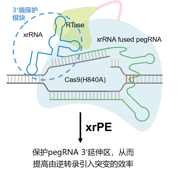 CRISPR-Cas基因组编辑技术在10年前的问世,为生命科学带来了革命。人们随后在提高基因组“改写”精准性上开展了不断的探索。其中,2019年开发的“先导编辑”(prime editing,PE)技术,是向着精准编辑基因组目标的一个重要突破。Prime editor的核心由带有逆转录酶结构域的Cas9缺口酶融合蛋白、以及先导编辑guide RNA(pegRNA)两部分组成。这里,pegRNA除了驱动在靶位点处形成缺口,其3端另含有携带突变信息的延伸序列,可进一步介导缺口链DNA的逆转录。因此,PE能够在规避双链DNA断裂条件下造成精准的碱基突变或小片段插入/缺失。然而,目前整体来看PE的编辑效率仍不理想,这成为其广泛应用的主要瓶颈。