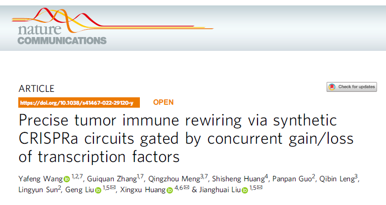 2022年3月18日,南京大学医学院模式动物研究所、医药生物技术国家重点实验室成员团队协同上海科技大学、南京市鼓楼医院等合作单位在《自然-通讯》杂志(Nature Communications)发表了题为“Precise tumor immune rewiring via synthetic CRISPRa circuits gated by concurrent gain/loss of transcription factors”的研究论文。该研究首次构建了响应肿瘤细胞中转录因子信号同时获得和丢失的CRISPRa基因环路,一方面能精准识别肿瘤,另一方面能恰当启动抗肿瘤免疫,产生特异及有效的治疗效应。