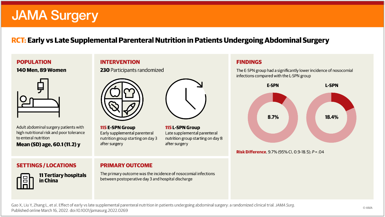 2022年3月16日,色情动漫 附属金陵医院(东部战区总医院)普通外科王新颖教授团队在国际外科学顶级期刊《JAMA Surgery》(美国医学会杂志外科学,影响因子14.8分)杂志,在线发表题为《Effect of Early vs Late Supplemental Parenteral Nutrition in Patients Undergoing Abdominal Surgery: A Randomized Clinical Trial》一项重大临床研究成果。《JAMA Surgery》创刊于1920年,是医学四大期刊之一《JAMA》美国医学会杂志的系列成员。本研究是国际上第一个探讨腹部外科病人术后补充性肠外营养应用时机的多中心临床随机研究,也是中国学者在《JAMA Surgery》上发表的首篇外科营养领域的多中心临床研究。