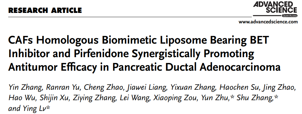 2023年11月16日,南京大学医学院附属鼓楼医院吕瑛教授、张舒博士和朱运药师在Advanced Science在线发表题为CAFs Homologous Biomimetic Liposome Bearing BET Inhibitor and Pirfenidone Synergistically Promoting Antitumor Efficacy in Pancreatic Ductal Adenocarcinoma的研究论文,该研究对胰腺癌肿瘤微环境中CAFs的功能表型进行了全面的描述,设计新型靶向材料针对CAFs,为胰腺癌的治疗提供新的理论基础和治疗见解。南京大学医学院附属鼓楼医院吕瑛教授、张舒博士,朱运博士为本文的共同通讯作者。南京大学医学院硕士研究生张尹、南京大学生命科学学院博士研究生于冉冉、南京大学医学院附属鼓楼医院赵成博士为本文的共同第一作者。