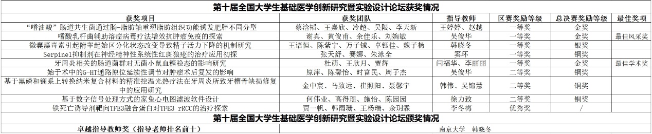8月22日至25日,第十届全国大学生基础医学创新研究暨实验设计论坛在羊城广州盛大闭幕。南京大学医学院的学子们在此次盛会中勇夺多项荣誉,总决赛中荣获金奖3项,银奖1项,铜奖4项,其中两组金奖队伍还分获最佳风采奖及最佳学术奖,我院韩晓冬教授获卓越指导教师奖;在分区赛(东部赛区、口腔赛道、交叉赛道)中,更是以一等奖5项、二等奖3项、优秀奖1项的卓越成绩,展现了医学院学子的非凡实力。