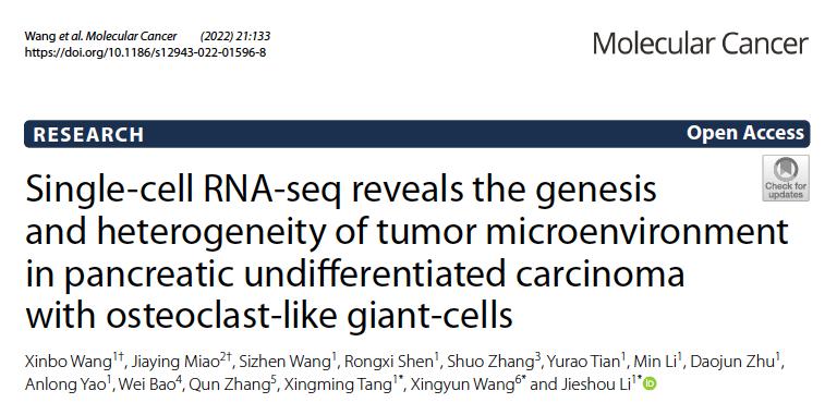 上述研究成果“Single-cell RNA-seq reveals the genesis and heterogeneity of tumor microenvironment in pancreatic undifferentiated carcinoma with osteoclast-like giant-cells”已于2022年6月23日在线发表于国际肿瘤生物学领域顶尖期刊《Molecular Cancer》杂志上。论文的通讯作者为南京大学医学院附属金陵医院黎介寿院士、唐星明教授和上海交通大学王星云教授,第一作者为王新波教授,数名院内胆胰肿瘤多学科综合诊疗协作组成员是重要参与者,研究工作得到了任建安教授、朱维铭教授的大力支持以及国家重点临床专科-普通外科建设项目、江苏省临床医学中心创新平台等项目的经费资助。