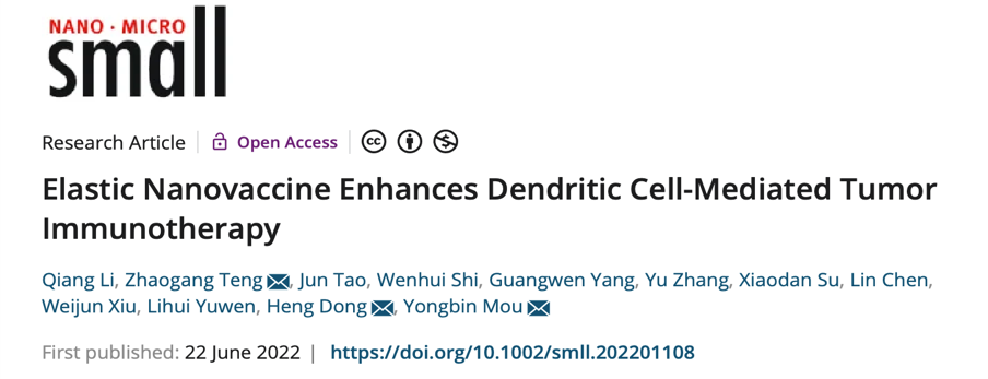 上述研究成果“Elastic Nanovaccine Enhances Dendritic Cell-Mediated Tumor Immunotherapy”已于2022年6月22日在线发表于国际知名期刊《Small》,并被遴选为《Small》该期封底内页(Inside Back Cover)论文。论文通讯作者为南京大学医学院附属口腔医院牟永斌教授、南京邮电大学滕兆刚教授以及南京大学医学院附属口腔医院董衡医生,第一作者为南京大学医学院博士研究生李强。该研究受到国家自然科学基金面上项目、江苏省重点研发计划(社会发展)项目、江苏省自然科学基金、南京市卫生科技发展专项资金项目计划等基金资助。