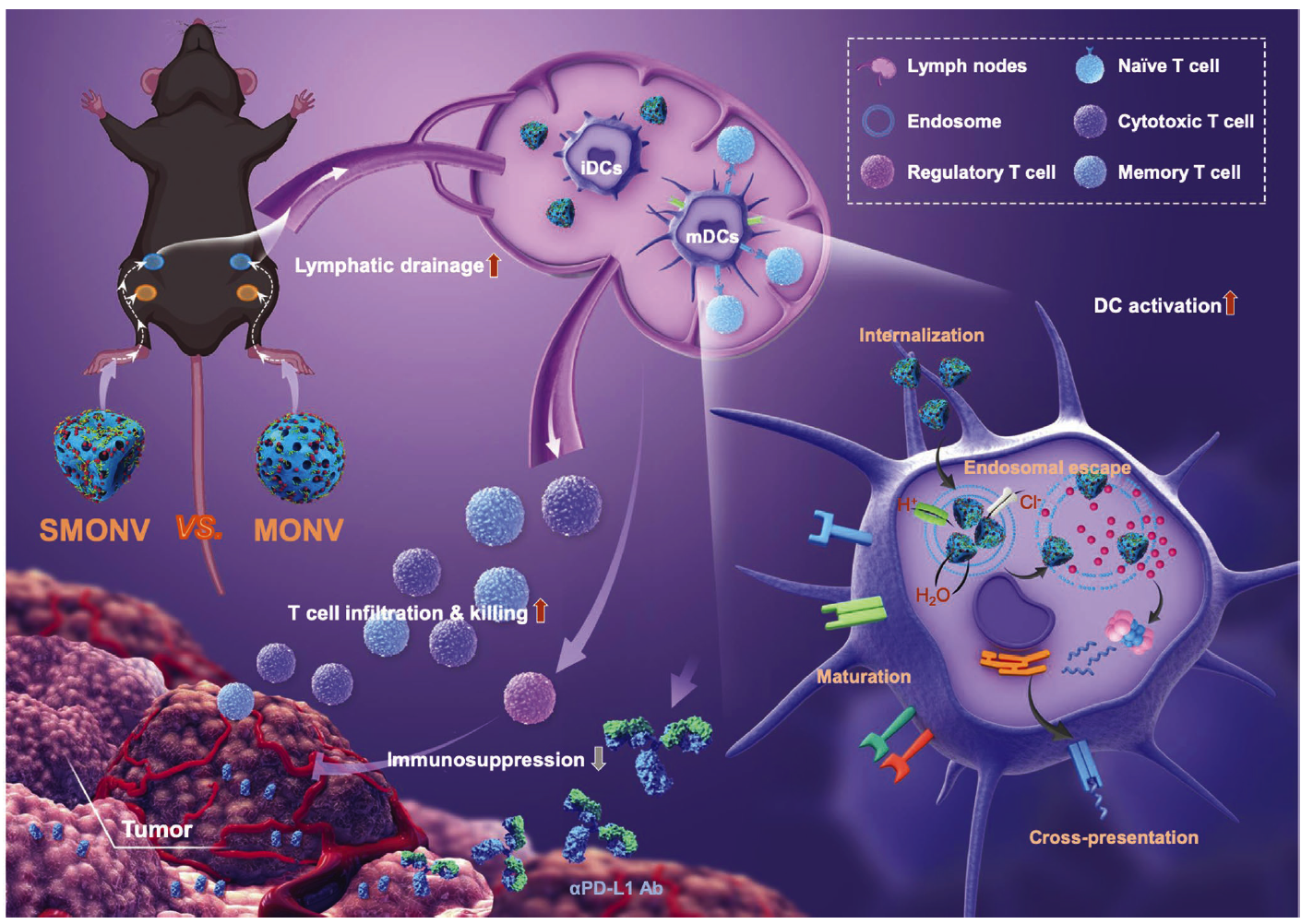南京大学医学院附属口腔医院牟永斌教授团队与南京邮电大学滕兆刚教授团队合作,制备了一种柔性介孔有机硅基纳米疫苗(SMONV),并研究了该纳米疫苗机械性能对DC介导免疫应答的影响及相关机制。 研究发现,SMONV因其柔性可促进DC对抗原蛋白更多的摄取,通过内体逃逸诱导大量抗原的胞质递送,引起DC有效成熟和抗原交叉提呈。 此外,柔软特性使SMONV提升了体内抗原的淋巴引流效率,激活了高效的体液和细胞免疫。荷瘤小鼠纳米疫苗接种的结果进一步表明,皮下注射SMONV可高效诱导抗原特异性CD8+ T细胞免疫响应,改善调节性T细胞介导的免疫抑制,增强记忆T细胞介导的免疫记忆,有效抑制荷瘤小鼠的肿瘤生长。 此外,SMONV和抗PD- L1抗体联合应用可进一步增强其抗肿瘤效果。