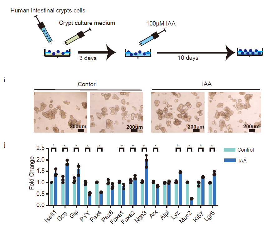 After the intervention of IAA in TPN mice, it was found that IAA could significantly alleviate the glucose metabolism disorders, and also affect the expression of GLP-1, an important factor regulating the homeostasis of glucose metabolism. Furthermore, Xinying Wang’s group generated the mouse and human intestinal organoids, and found that IAA stimulation upregulated the expression of genes related to proliferation (Ki-67), differentiation (Pax6, Foca1, Ngn3), and GLP-1 secretion (Gcg) in L-Cells (Fig.3).